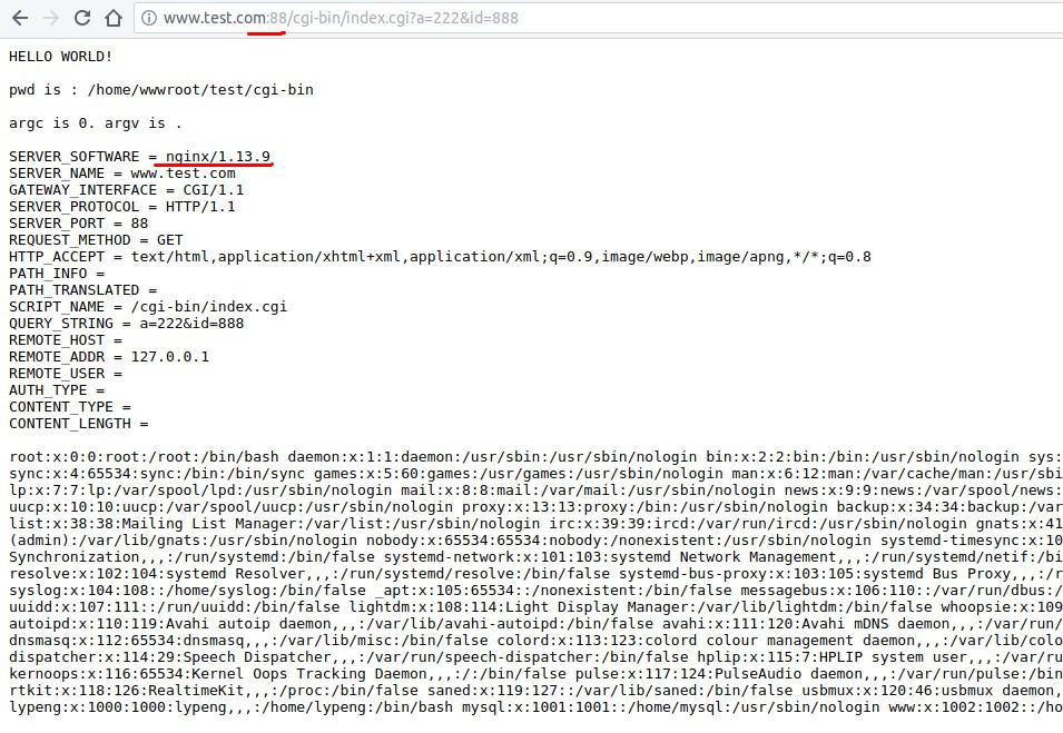 # 怎么让URL执行一个shell脚本。 这里分Apache与nginx两部分说明。其实这个问题可以扩大为:怎么让URL执行一个CGI程序? 什么是CGI与CGI程序? > 具体参见:https://blog.csdn.net/JAVA_SanXin/article/details/51496688?_blank > CGI其实是一个接口规范,并且按照CGI接口规范开发的程序都可以叫做CGI程序。 > 那么可以用来开发CGI的程序有哪些呢?C、Java、PHP、Perl、Asp、.Net等。 > 用Perl编写的CGI程序后缀为:.pl;Python编写的CGI程序后缀为:.py;而C编写的CGI程序后缀为:.cgi,如果在win下编译出来的是.exe,最好将它重命名为.cgi。 > 这些都是为了HTTP服务能够识别并调用它们 这里主要说shell脚本。 问题总结:即我在网站文件中写一个t.sh脚本(内容如下),怎么通过:`http://www.test.com/t.sh` 形式显示到页面上! ```bash #!/bin/bash echo 'hello world' ``` 问题描述完毕,来说解决方案~ -------- # Apache部分 相对容易些,已经有了写好的模块。 ## 开启模块,修改httpd.conf文件 `LoadModule cgid_module modules/mod_cgid.so` ## 把shell脚本放到这个目录就可以执行了~ `/usr/local/apache/cgi-bin` 自带的test-cgi 可以加后缀.sh或者.cgi,浏览器执行即可  注解:当遇到cgi-bin的时候,由于httpd.conf配置文件中有个alias别名定义,会自动定位到/usr/local/apache/cgi-bin目录中寻找你的脚本文件,而不是你的test.com网站目录中。 ```bash