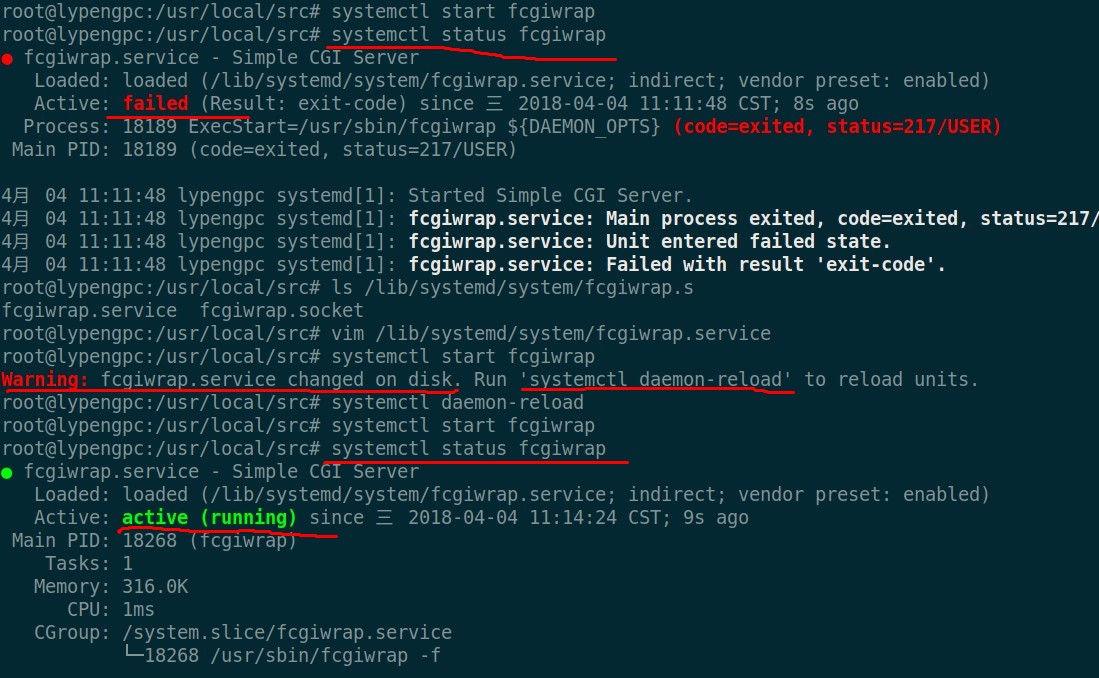 ``` ------------------ # nginx部分 既然nginx可以把PHP文件通过fastcgi转发给9000端口,那么是否也可以把cgi/sh后缀的转发给一个shell的处理器~ 转发工具有了,转发给谁?这个处理器去哪儿找?百度一下,找到:fcgiwrap 官网地址:https://www.nginx.com/resources/wiki/start/topics/examples/fcgiwrap/?_blank ``` # 2019-04-28 # centos操作 # 安装后,新增/etc/init.d/fcgiwrap文件,内容如下 #!/usr/bin/perl use strict; use warnings FATAL => qw( all ); use IO::Socket::UNIX; my $bin_path = '/usr/local/sbin/fcgiwrap'; my $socket_path = $ARGV[0] || '/tmp/fcgiwrap.sock'; my $num_children = $ARGV[1] || 1; close STDIN; unlink $socket_path; my $socket = IO::Socket::UNIX->new( Local => $socket_path, Listen => 9003, ); die "Cannot create socket at $socket_path: $!\n" unless $socket; for (1 .. $num_children) { my $pid = fork; die "Cannot fork: $!" unless defined $pid; next if $pid; exec $bin_path; die "Failed to exec $bin_path: $!\n"; } #使用 /etc/init.d/fcgiwrap start 启动 ``` 下面使用apt-get方式安装,编译安装方式其实结果一样~ ```bash apt-get install fcgiwrap # cp /usr/share/doc/fcgiwrap/examples/nginx.conf /etc/nginx/fcgiwrap.conf # include /etc/nginx/fcgiwrap.conf; # cp与include这两步都不需要,直接在nginx的server中手动配置 /etc/init.d/fcgiwrap start # fcgiwrap这个脚本如果是apt-get安装的,则已经写好了,直接start启动,后面还可以跟stop/restart/status # 执行后,显示内容如下: [ ok ] Starting fcgiwrap (via systemctl): fcgiwrap.service. # 看到OK,我开始还以为启动成功了! /etc/init.d/fcgiwrap status #检查状态,一直是fail失败 # 反应过来,需要使用systemctl命令启动 systemctl start fcgiwrap #查看启动状态 systemctl status fcgiwrap #启动成功后,会生成一个socket文件,在/var/run/fcgiwrap.socket ps aux | grep fcgiwrap #查看进程是否存在,并且注意是以什么用户身份运行的 #OK,到这里基本上就算完成80%了,剩下配置server了 #你可以匹配网站的/cgi-bin目录,也可以匹配.cgi或.sh或.pl后缀 location /cgi-bin/ { gzip off; fastcgi_pass unix:/var/run/fcgiwrap.socket; #转发到socket处理CGI fastcgi_index index.cgi; #同PHP,可以定义一个默认首页 include fastcgi_params; #包含fastcgi相关参数 fastcgi_param SCRIPT_FILENAME /home/wwwroot/test$fastcgi_script_name; #定义脚本文件 } # 或者如下 location ~ \.(cgi|sh)(.*)$ { gzip off; fastcgi_pass unix:/var/run/fcgiwrap.socket; fastcgi_index index.cgi; include fastcgi_params; fastcgi_param SCRIPT_FILENAME /home/wwwroot/test$fastcgi_script_name; } ```    ## 遇到的错误,主要是502与403 ### 502错误一,具体原因查看日志吧,`vim /usr/local/nginx/logs/error.log` 不能连接fcgiwrap.socket,连接拒绝! > 2018/04/04 11:10:42 [error] 16335#0: *45 connect() to unix:/var/run/fcgiwrap.socket failed (111: Connection refused) while connecting to upstream, client: 127.0.0.1, server: www.test.com, request: "GET /cgi-bin/t.cgi HTTP/1.1", upstream: "fastcgi://unix:/var/run/fcgiwrap.socket:", host: "www.test.com:88" #### 解决: 1. 查看fcgiwrap.socket文件是否存在 `ll /run/` 2. 查看fcgiwrap服务是否运行 `systemctl status fcgiwrap` 3. 检查运行的用户是否一致,我这里统一使用www用户 a.修改nginx.conf,最上边,user www; b.修改/lib/systemd/system/fcgiwrap.service文件中的,user与group为www,默认用户是www-data,而我系统中,没有www-data,所以会启动失败 ```bash [Unit] Description=Simple CGI Server After=nss-user-lookup.target Requires=fcgiwrap.socket [Service] Environment=DAEMON_OPTS=-f EnvironmentFile=-/etc/default/fcgiwrap ExecStart=/usr/sbin/fcgiwrap ${DAEMON_OPTS} User=www Group=www [Install] Also=fcgiwrap.socket ``` 修改后重载服务  ### 502错误二,from upstream 读取header信息时,输出被关闭 > 2018/04/04 11:27:02 [error] 18375#0: *62 upstream prematurely closed FastCGI stdout while reading response header from upstream, client: 127.0.0.1, server: www.test.com, request: "GET /cgi-bin /index.cgi HTTP/1.1", upstream: "fastcgi://unix:/var/run/fcgiwrap.socket:", host: "www.test.com: 88" #### 解决: 应该是输出内容的形式未定义,需要在文件头部增加`echo "Content-type: text/plain; charset=iso-8859-1"`(来自Apache的默认test-cgi文件中) ### 中文乱码 将上面的编码`iso-8859-1` 改为`utf-8`即可 ### 403错误,不能得到脚本名称 > 2018/04/04 11:14:48 [error] 16335#0: *53 FastCGI sent in stderr: "Cannot get script name, are DO CUMENT_ROOT and SCRIPT_NAME (or SCRIPT_FILENAME) set and is the script executable?" while readin g response header from upstream, client: 127.0.0.1, server: www.test.com, request: "GET /cgi-bin /t.cgi HTTP/1.1", upstream: "fastcgi://unix:/var/run/fcgiwrap.socket:", host: "www.test.com:88" #### 解决: 你的nginx配置问题,见附录 或者文件没有执行权限:执行`chmod a+x index.cgi`增加权限 #附录,放一个nginx中的完整配置 ``` server { listen 88; server_name www.test.com; root /home/wwwroot/test; location / { index index.html index.php; } location ~ .*\.(sh|cgi)(.*)$ { include fastcgi_params; fastcgi_pass unix:/tmp/fcgiwrap.socket; fastcgi_index index.cgi; fastcgi_param SCRIPT_FILENAME /home/wwwroot/test$fastcgi_script_name; } location ~ \.php(.*)$ { fastcgi_pass 127.0.0.1:9000; fastcgi_index index.php; set $fileroot /home/wwwroot/test; set $path_info ""; set $real_script_name $fastcgi_script_name; if ($fastcgi_script_name ~ "^(.+?\.php)(/.+)$") { set $real_script_name $1; set $path_info $2; } fastcgi_param PATH_INFO $path_info; fastcgi_param SCRIPT_NAME $real_script_name; fastcgi_param SCRIPT_FILENAME $fileroot$real_script_name; include fastcgi_params; } } ```