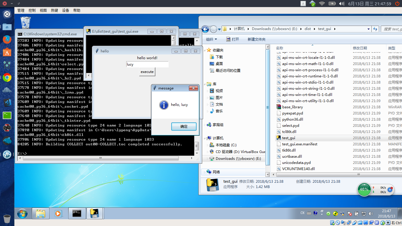 # 先放效果图  # 介绍 把一个Python的GUI程序,打包成一个exe程序,这样你写的东西,就可以给Windows系统的人使用了,而别人也不需要安装Python就能直接双击主程序运行。 # 版本说明 Windows 7_64位 Python 3.6.5 pip 10.0.1 pyinstaller 3.3.1 # 步骤说明 1. 必须在Windows下打包,Linux无效,因为EXE程序打包后会依赖很多的DLL库 2. 在Windows下,安装anaconda,安装过程中注意给是否添加path打钩,然后pip install pyinstaller 3. 运行`pyinstaller test_gui.py`打包 4. 打包结束,会生成build与dist文件夹 5. 运行dist下面的主程序test_gui.exe即可 在win7_64下面运行正常,没有在win7_32位/win8/win10下面测试! 放打包后的Zip包,大家可以测试看看,^O^