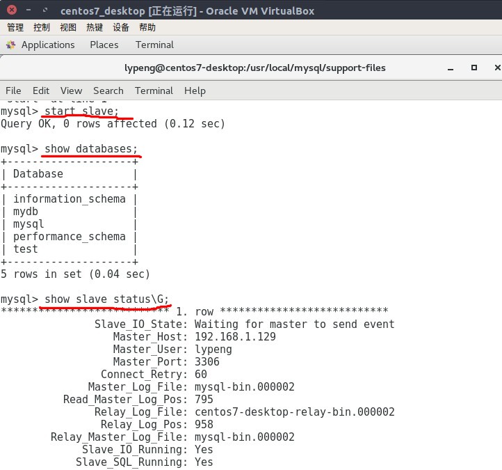 主从同步相对读写分离来说,配置起来容易点,至少需要两台主机~ 我这里用到的如下,Ubuntu16.04系统安装virtualbox,然后装虚拟机centos7 ## 环境版本信息 |IP地址|说明|系统|MYSQL| |--|--|--|--| |192.168.1.129| 主库master|物理机-Ubuntu16.04|mysql_5.7.22| |192.168.1.130| 从库slave|虚拟机-centos7_desktop|mysql-5.6.40| ## 前提要求 ### 安装MySQL 略过,参见:https://www.cnblogs.com/panzhaohui/p/7169905.html?_blank ### 两台机器能够互通 1. 设置虚拟机网络模式为桥接模式。 如果为nat模式,与主机设置同一网段的静态IP后是无法上网的 2. 配置静态IP centos_desktop版安装的直接在桌面右上角点击网络修改,最后把4关闭,再开启即可。  centos_mini版安装的修改 `/etc/sysconfig/network-scripts/ifcfg-enp0s3`,内容如下图右边,重启网络`systemctl restart network`,ifconfig查看是否生效。  备注:mini版的必须加上gateway,否则无法解析域名,或者要使用`route add default gw 192.168.1.1`配置路由 3. 注意防火墙,3306端口等是否可以互通访问。 可以用80端口做测试,例如:`yum -y install httpd`,`systemctl start httpd`,`curl -I 192.168.1.130:80` ## 准备完毕开始配置 ### 主库操作 这里仅针对mydb数据库做练习。从库配置完成后创建。 #### 配置(设置server-id,开启binlog,设置同步数据库,这里列出主要配置) ``` [mysqld] server-id=1 log-bin=mysql-bin binglog-format=mixed binlog-do-db=mydb ``` #### 创建用户与授权 `create user lypeng@192.168.1.130 identified 'lypeng123'` `grant ALL privileges on mydb.* to lypeng@192.168.1.130` 或者将上面两条合并,创建用户同时授予权限 `grant all privileges on mydb.* to lypeng@192.168.1.130 identified 'lypeng123';` #### 刷新权限 `flush privileges;` #### 重置master,binlog信息 `reset master` 作用:刚开始你可以有很多binlog,例如mysql-bin.000001,mysql-bin.000002,000003,000004,000005等等,reset之后,将重新从000001开始记录,删除其他的~ #### 查看主库binlog状态 `show master status;` ### 从库操作 #### 配置(设置server-id) ``` server-id=2 ``` 不用开启binlog,开了也无所谓,不影响什么,同步时会生成,relaylog,互相不冲突~ #### 设置master信息 `change master to master_host='192.168.1.129',master_user='lypeng', master_password='lypeng123',master_log_file='mysql-bin.000002',master_log_pos=120;` #### 启动同步 `start slave;`  ### 回到主库 按上面的操作完毕后,在主库建立数据库mydb,然后建表,增删改查, ### 回到从库 查看数据是否已经同步过来了 ``` show databases; use mydb; select * from user; ```  如果没有,可以查看状态,然后根据错误提示去调整 `show slave status\G;` ### 后续操作 如果要停止同步,执行:`stop slave;` 或者重置slave,清除从库角色,即取消从master的同步信息:`reset slave all;` 如果要增加更多的从库,注意配置server-id不一样,同时修改那个授权用户的IP,可以写为%