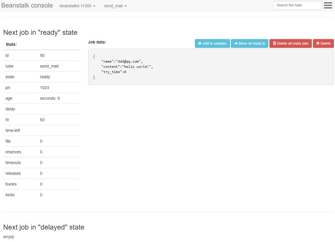 ## 先看作者给的两张流程图: 来自:https://github.com/beanstalkd/beanstalkd/blob/master/doc/protocol.txt?_blank ``` Here is a picture of the typical job lifecycle: put reserve delete -----> [READY] ---------> [RESERVED] --------> *poof* Here is a picture with more possibilities: put with delay release with delay ----------------> [DELAYED] <------------. | | | (time passes) | | | put v reserve | delete -----------------> [READY] ---------> [RESERVED] --------> *poof* ^ ^ | | | \ release | | | `-------------' | | | | kick | | | | bury | [BURIED] <---------------' | | delete `--------> *poof* ``` 再放一张来自CSDN的图:  ## 简要描述 一个beanstalk服务,可以开启很多个tube(即,发邮件的,发短信的,执行抓取文章的,好多任务),每一个tube有很多个job组成(给用户一发AAA,给用户二发BBB),job有ready(准备好了)、dalayed(延迟稍候执行)、 reserved(正在执行)、bury(掩埋起来,以后再执行)几个状态。 示例: 我们有一个发送邮件的tube,send_mail ``` { job1 : {username:123@qq.com,content:'con1'} status:ready job2 : {username:456@qq.com,content:'con2'} status:bury } ``` 如果安装了beanstalkd console可以看到每个job的更多字段信息,如下图:  我们每次从状态值为ready里面读取job,然后执行!执行成功可以删除,执行失败,可以放入延迟里面稍候执行,或者掩埋起来先不处理 ## 上代码: 安装略过,php使用的Pheanstalk\Pheanstalk类库 ```php namespace app\controller; use Pheanstalk\Pheanstalk; class BeanstalkController { public function __construct(){ $this->p = Pheanstalk::create('192.168.1.190',11300); } // 这个是交给定时任务crontab执行的 // */1 * * * * php index.php /beanstalk/index public function index(){ if($this->check_tube('send_mail')){ $this->consumer(); } } // 生成任务 public function productor(){ // put命令的四个参数(string $data, int $priority, int $delay, int $ttr) // priority 优先级,数字小的优先执行,范围0-2^32-1 // delay 延迟秒数,范围0-2^32-1 // ttr 运行时间,(没有理解透),范围1-2^32-1 // max-job-size (default: 2**16) $mail_json = json_encode(['name'=>'ddd@qq.com','content'=>'hello world!','try_time'=>0]); $this->p->useTube('send_mail')->put($mail_json); //正常放入reday队列 // $this->p->useTube('send_mail')->put($mail_json,10,3600); //延迟1个小时执行,优先级10,(必须传递个优先级,否则报错) } // 消费任务 public function consumer(){ $job = $this->p->watch('send_mail')->reserve(); $data = json_decode($job->getData(),true); // 发送邮件 sleep(3); $success = true; if($success){ // 发送成功处理 // 记录日志 $log_str = date('Y-m-d H:i:s',time()).":给".$data['name']."发送邮件成功!".PHP_EOL; file_put_contents('beanstalk.log', $log_str, FILE_APPEND); // 删除任务 $this->p->delete($job); }else{ // 发送失败处理 $data['try_time'] = empty($data['try_time']) ? 1 : $data['try_time']+1; $log_str = date('Y-m-d H:i:s',time()).":给".$data['name']."发送邮件失败!第".$data['try_time']."次.".PHP_EOL; file_put_contents('beanstalk.log', $log_str, FILE_APPEND); if($data['try_time'] == 3){ $this->p->bury($job); //掩埋 }else{ // 放入新任务(try_time+1),延迟60秒执行 $this->p->useTube('send_mail')->put(json_encode($data),10,60); //删除原任务 $this->p->delete($job); } // 或者线下记录try_time,$job->getId()可以获取到任务id,然后用release // $this->p->release($job,10,60); //延迟一分钟后放入ready执行 // $this->p->watch('send_mail')->peekBuried(); //取出bury状态的任务 } } // 检测队列是否需要执行 public function check_tube($tube_name=''){ if($tube_name == ''){ return false; } $tubes = $this->p->listTubes(); if(!in_array($tube_name, $tubes)){ // 该tube不存在 return false; }else{ $r = $this->p->StatsTube($tube_name); if($r->current_jobs_ready == 0){ // ready状态没有任务需要执行 return false; } } return true; } } ``` 参见: https://github.com/beanstalkd/beanstalkd?_blank https://blog.csdn.net/m_nanle_xiaobudiu/article/details/80466702?_blank