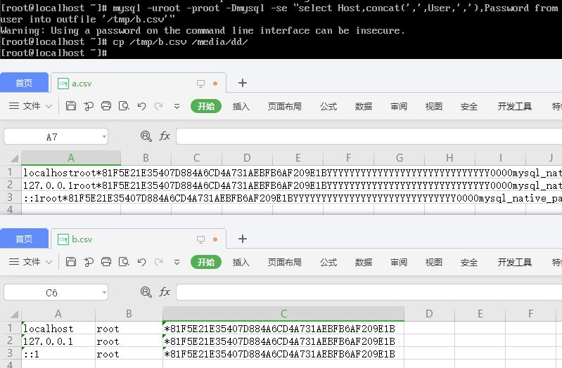 通过into outfile即可 ### 示例 ``` "select * from user into outfile '/tmp/a.txt'" "select id,name,age from user into outfile '/tmp/a.csv'" #这样查出来都混在一起,所以换种方式,中间加逗号分开 "select id,concat(',',name,','),age from user into outfile '/tmp/a.csv'" #在name字段两边都加逗号就好了 ``` 如下图,显示mysql库里面的user账号信息  ### 前提 需要设置一个变量secure_file_priv为空,默认是NULL 不能通过`set secure_file_priv=`命令设置,提示为只读变量,所以通过my.cnf设置后覆盖~ + secure_file_priv为null 表示不允许导入导出 + secure_file_priv指定文件夹时,表示mysql的导入导出只能发生在指定的文件夹 + secure_file_priv没有设置时,则表示没有任何限制 打开/etc/my.cnf文件,mysqld下面新增一行 ``` [mysqld] secure_file_priv= ```