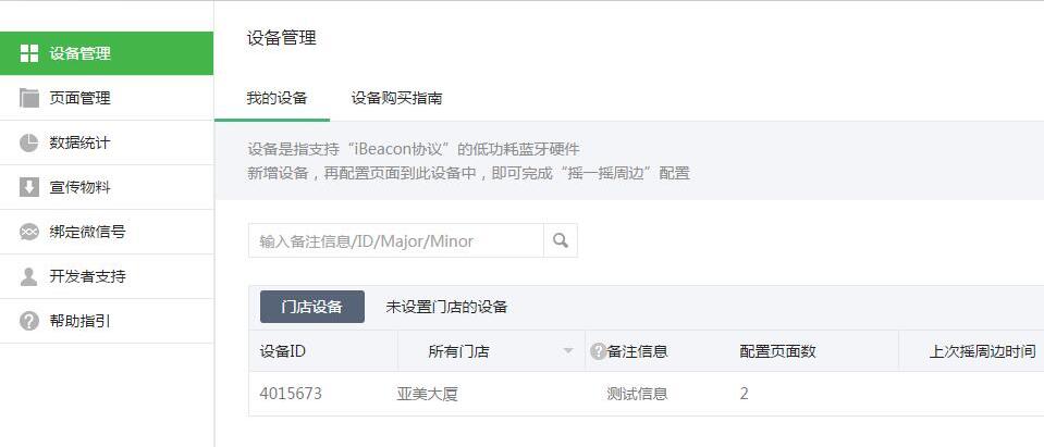 ###一、购买设备ibeacon 在网上买了一个设备,快递发错了,跑了大半个中国,用了一个礼拜,最后才到手中(汗~) ###二、公众号申请认证(实名认证等等那些东西) 公司业务已经帮我做好了(感谢她),我不用管了~ ###三、登录微信公众平台mp.weixin.qq.com 添加功能插件--》摇一摇周边--》申请开通--》等待审核通过,一般三四天时间就可以通过审核 ###四、操作,配置设备 买回来了,就一个圆形的设备,再没别的东西,线都没有,也没有操作说明书,无语很~最后发现操作说明在商品详情里面人家有写~我当时没看~ 好了,按2秒开启,再按2秒关闭,长按10秒左右恢复出厂设置~ ###关于配置 1.新增设备 参见:https://zb.weixin.qq.com/nearby/instruction.xhtml 2.在手机上下载app,配置设备 参见:https://zb.weixin.qq.com/nearby/instruction.xhtml?section=4 说明:第六条,我下载的lightblue,Major和Minor是分开的,需要分别配置 php中十进制转十六进制可使用函数dechex() 注意一点:dechex(10041)=2739,我开始写为2739,始终摇不出激活页面,提示“未能识别周围有效的信息,请重新尝试”,最后改为3927成功了~不知道为什么~ 3.激活设备 配置完了,摇出激活页面,点击下即可 4.添加页面 进入页面管理https://zb.weixin.qq.com/nearby/html/page/list.html 添加摇出的页面 ###五、附图