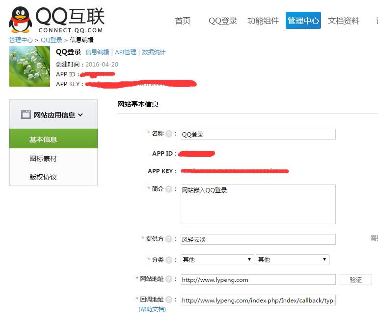 一个古老的话题,网站使用QQ登录,之前用原生的做过,但是没有整理,最近使用ThinkSDK,再体验一回,完成QQ登录,tp版本thinkphp3.2.3,遇到什么问题,欢迎评论反馈~ [点击下载DEMO文件](http://pan.baidu.com/s/1hsdKbJ2) [点击下载原ThinkSDK](http://pan.baidu.com/s/1kVvoO3H) 简单说明 针对自己网站情况,将所有文件复制到合适位置,修改config.php配置文件 1.qq.html 用于在QQ互联申请qq登录时验证网站地址 2.我的网站是由tp3.1升级到tp3.2的控制器名称沿用了Action,不是Controller,请注意针对自己网站修改 3.TypeEvent.class.php原ThinkSDK是放到Event目录的,感觉麻烦,放在Org目录了! 4.Thinkphp\Library\Org\ThinkSDK\sdk\文件夹里面,我只修改了QqSDK,其他的如果您想使用,请仿照QqSDK自己修改调试~ 例如增加命名空间等。。。 5.参考网址:http://www.th7.cn/Program/php/201512/736957.shtml 附相关图片